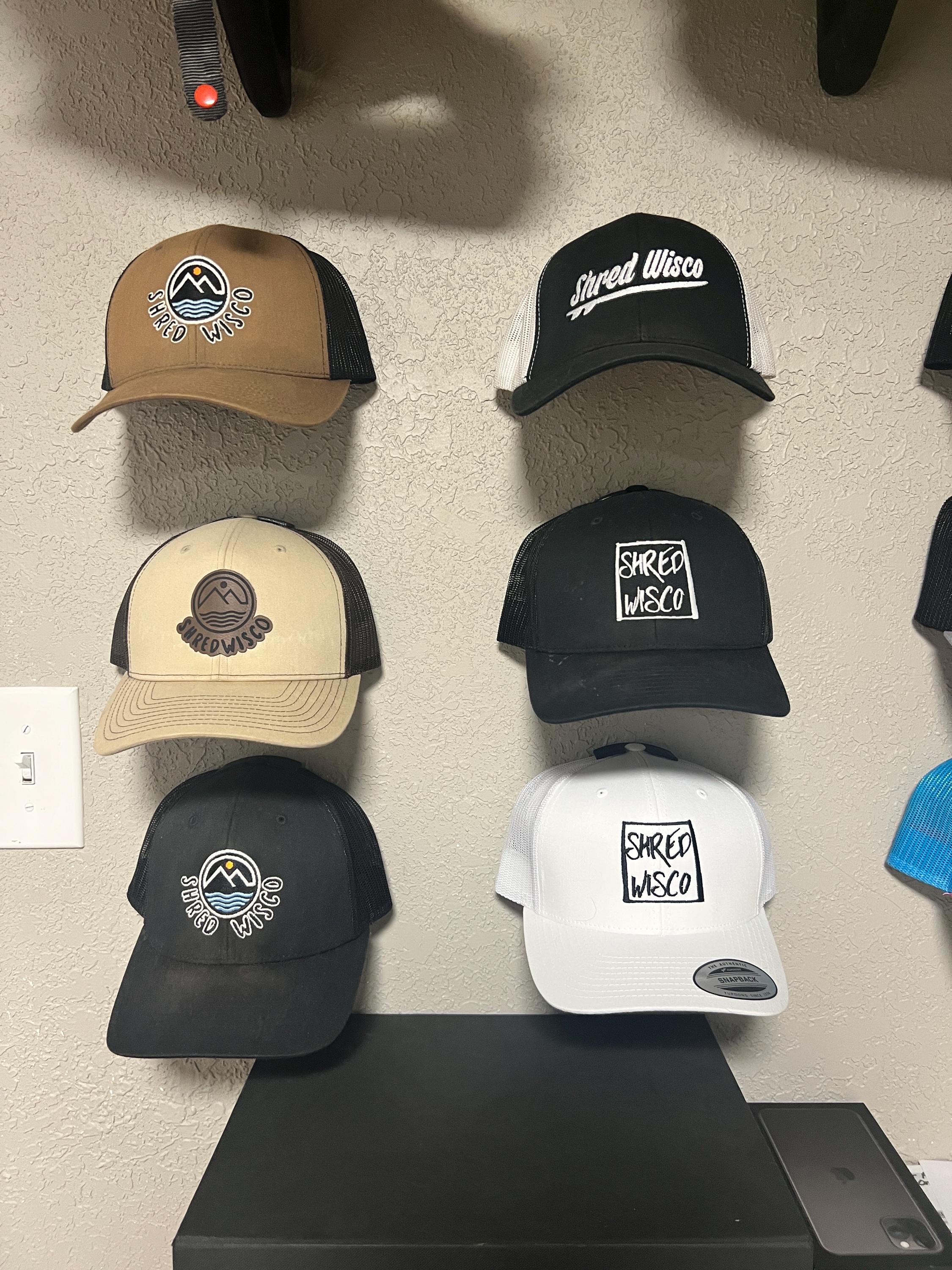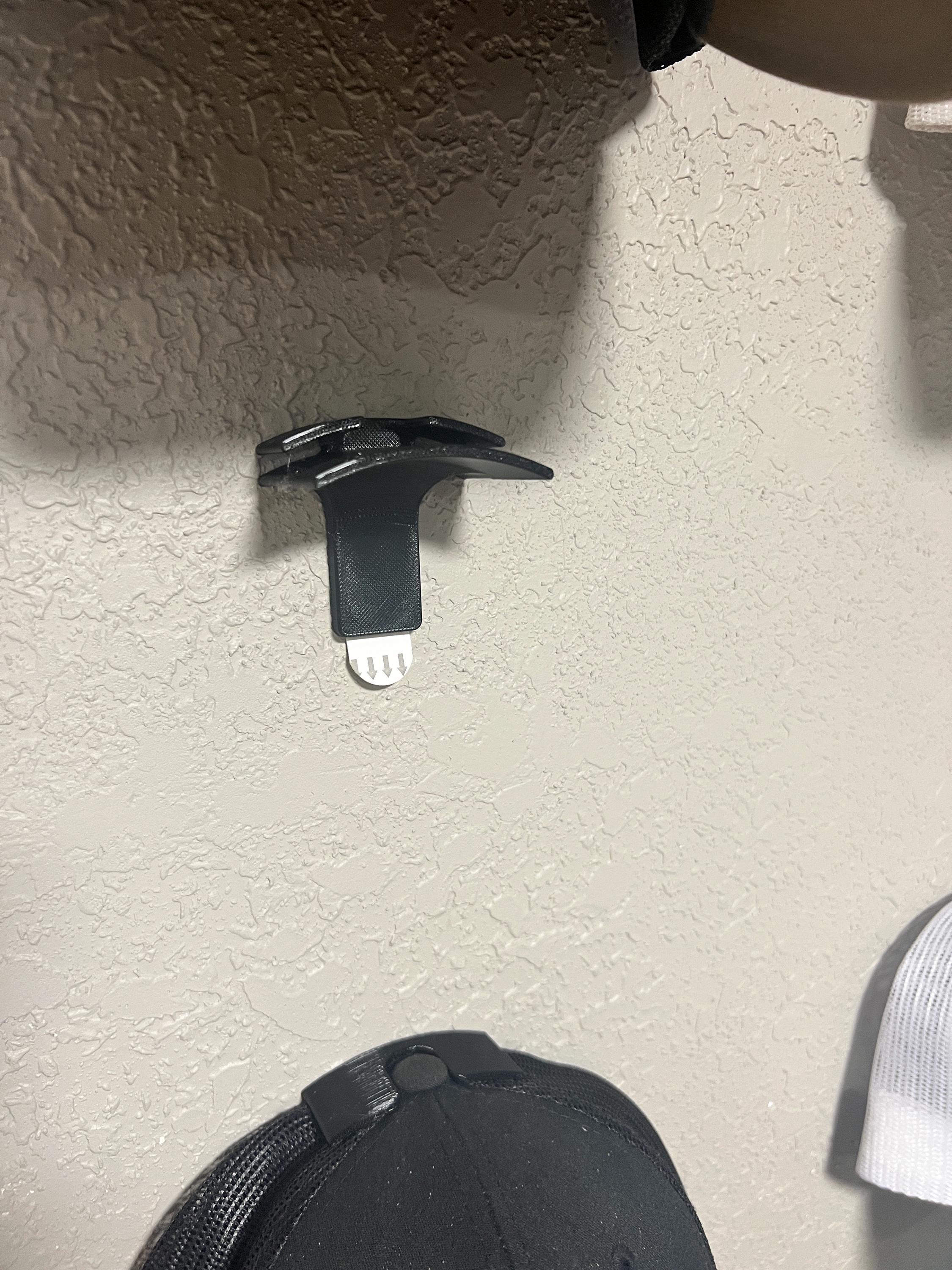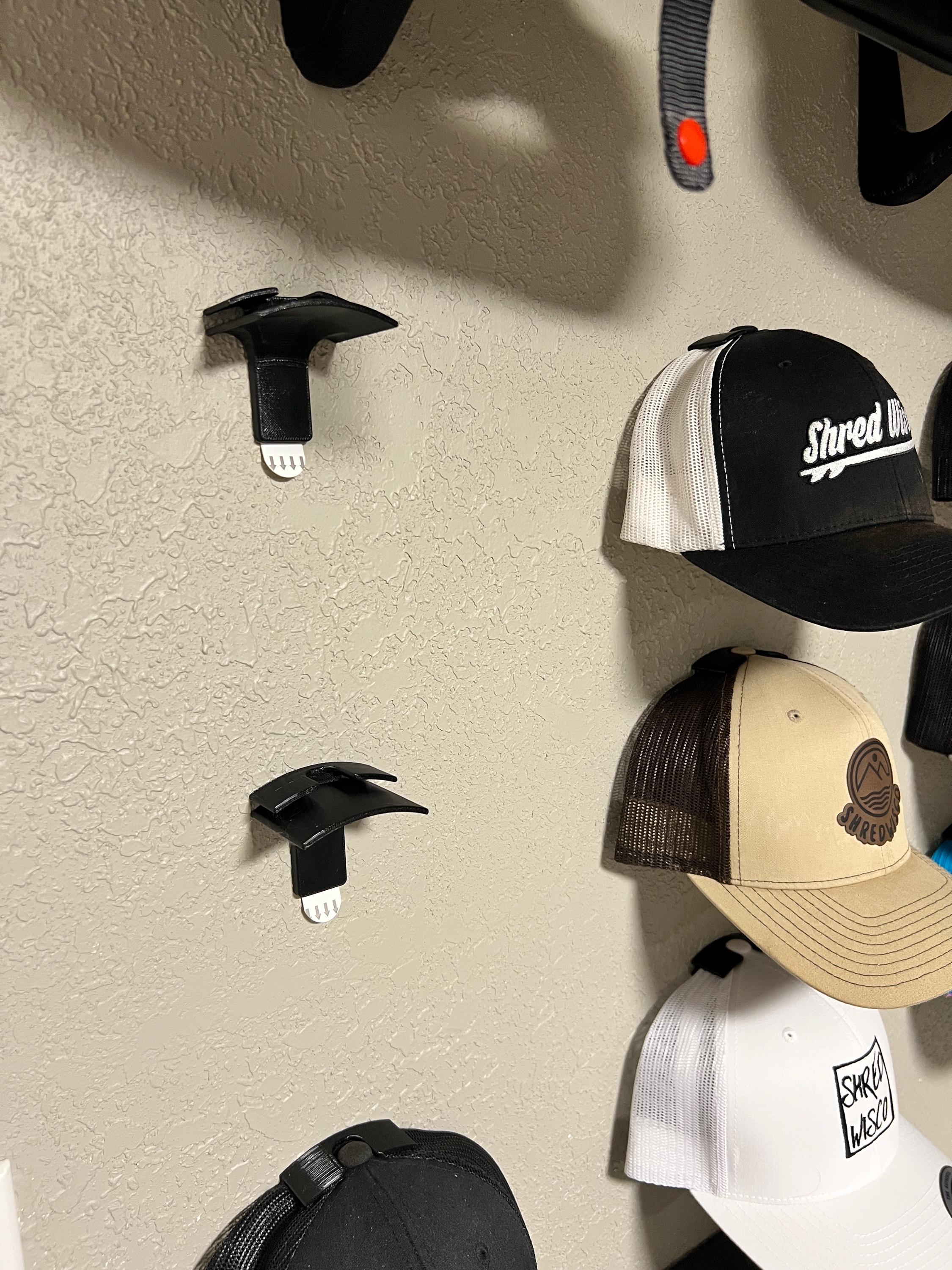 Floating wall mount for hats. Easily display hats on our wall. Easy removal if you want to wear and then put back.