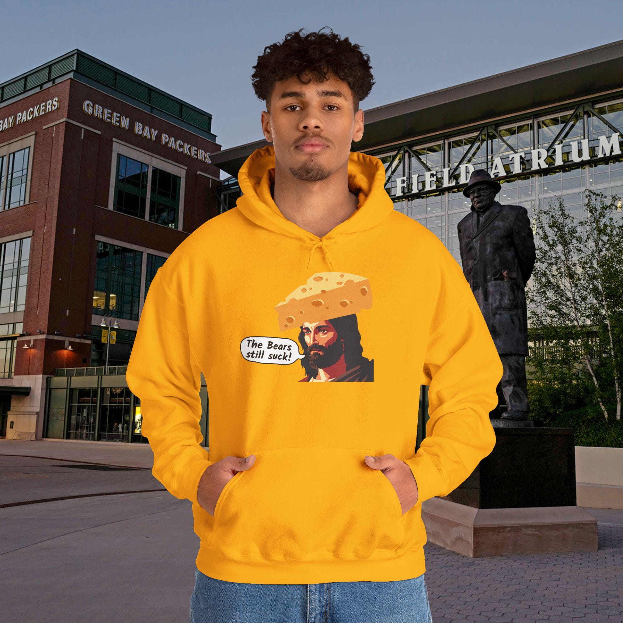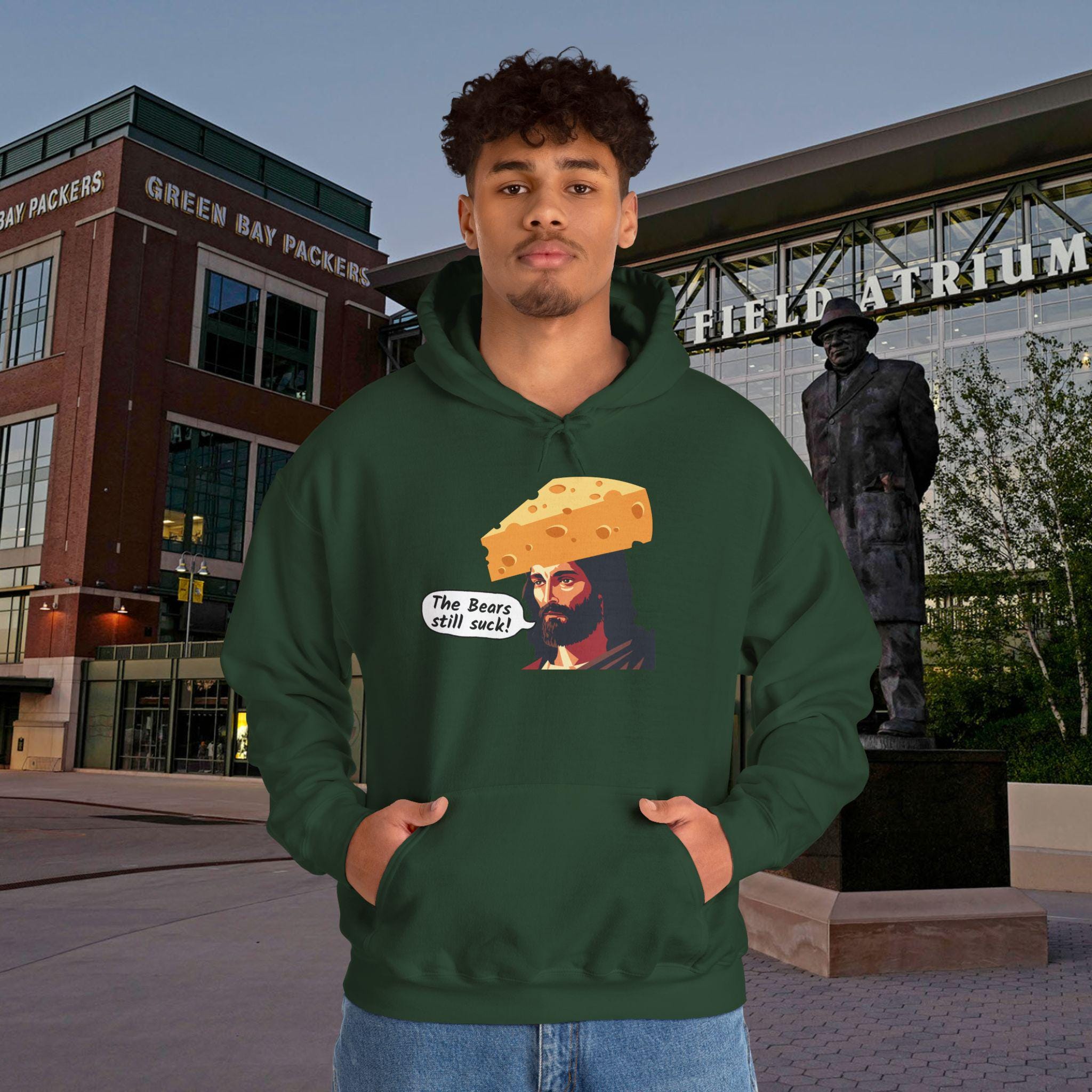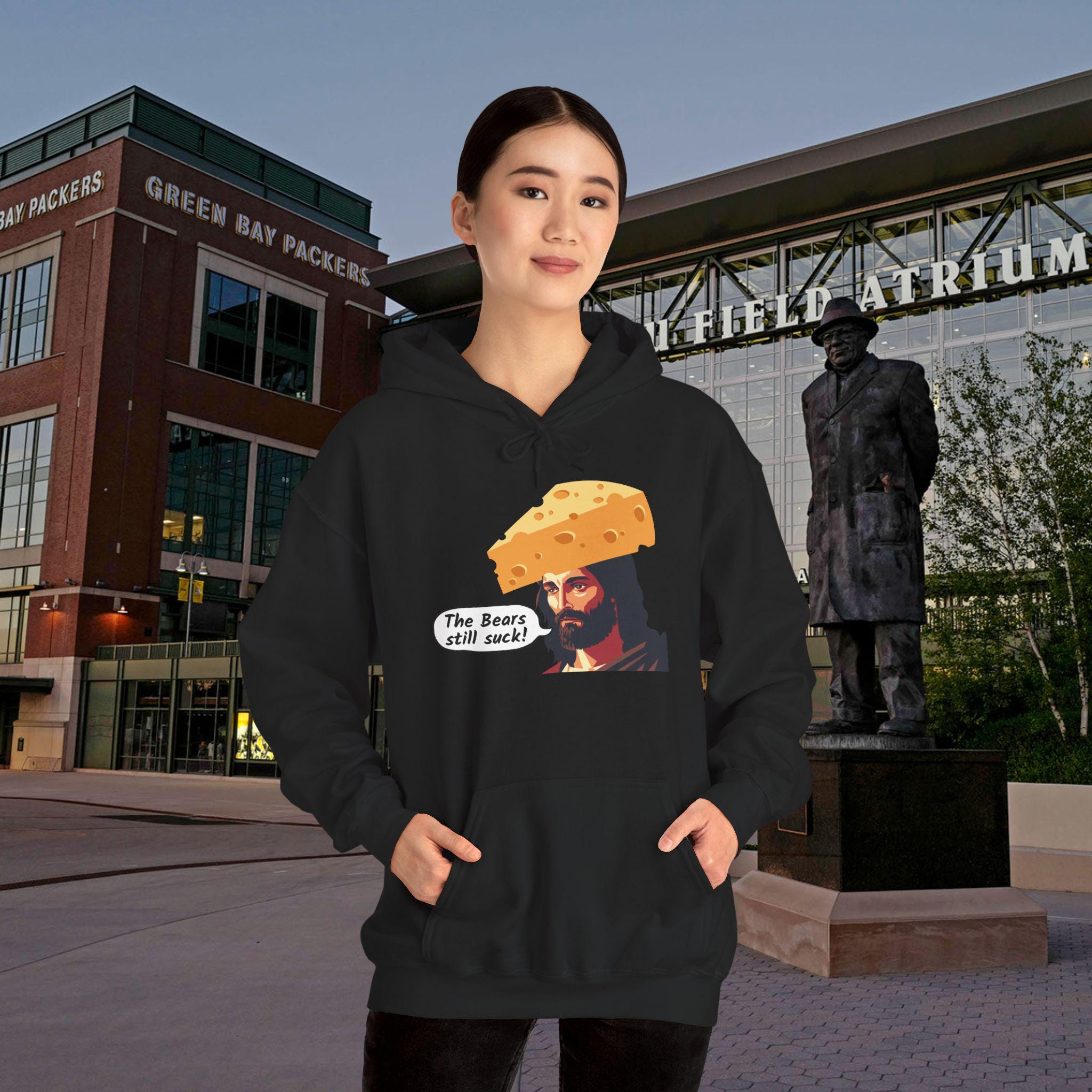This sweatshirt speaks like a teammate heckling from the stands — loud, irreverent, and proudly green-and-gold. It wears like your go-to tailgate layer: thick enough to hold warmth through late-night chants, soft where it rubs your neck, and built to survive beer spills and bus rides home. The bold “the bears still suck jesus” design reads like a winning chant; it cracks up fellow fans, starts conversations with strangers, and keeps the rivalry alive. Toss it on for game day, postgame celebrations, or walking the dog while replaying the final drives. It’s for the fan who laughs at trash talk, collects rivalry memories, and wants clothing that feels like another loyal friend at their shoulder.