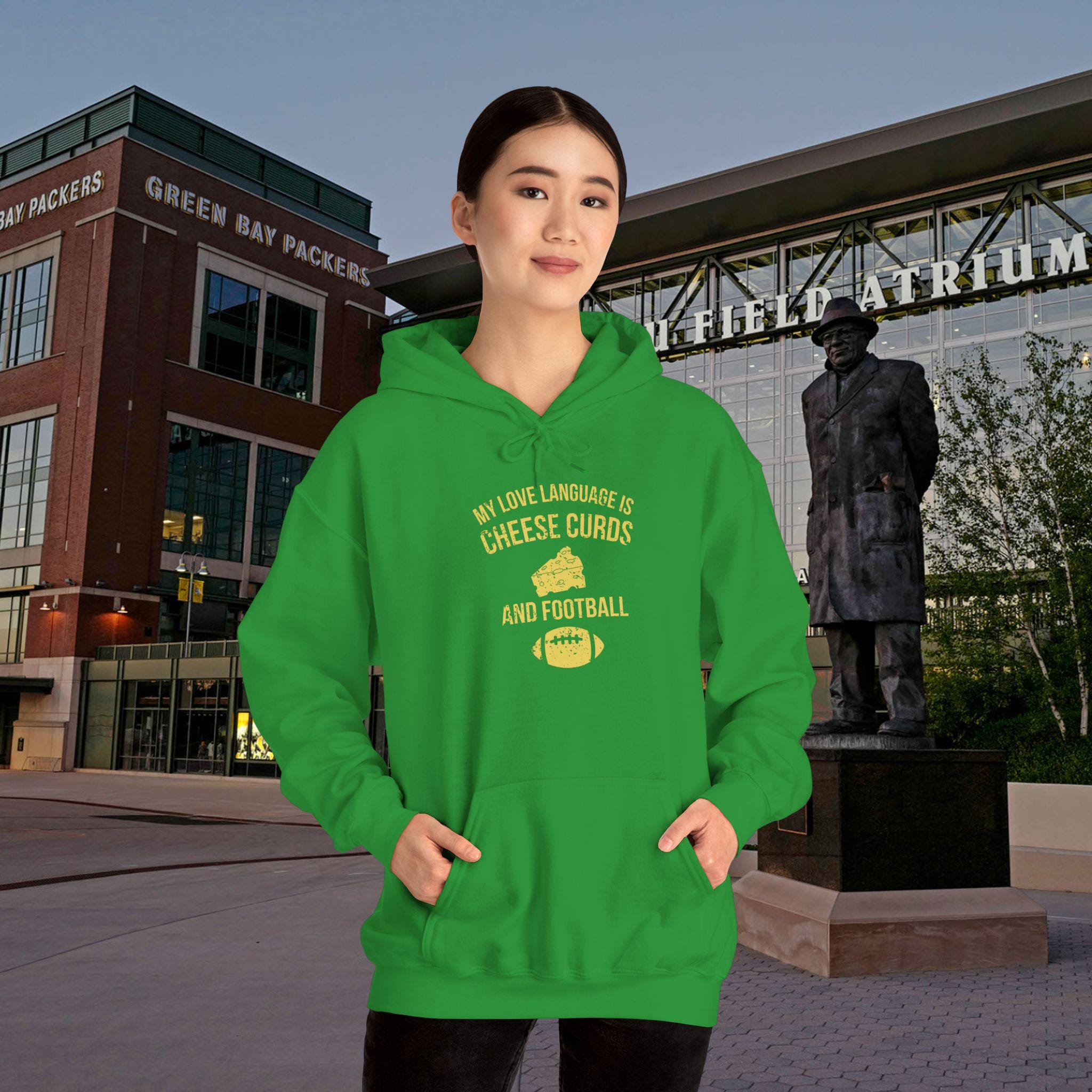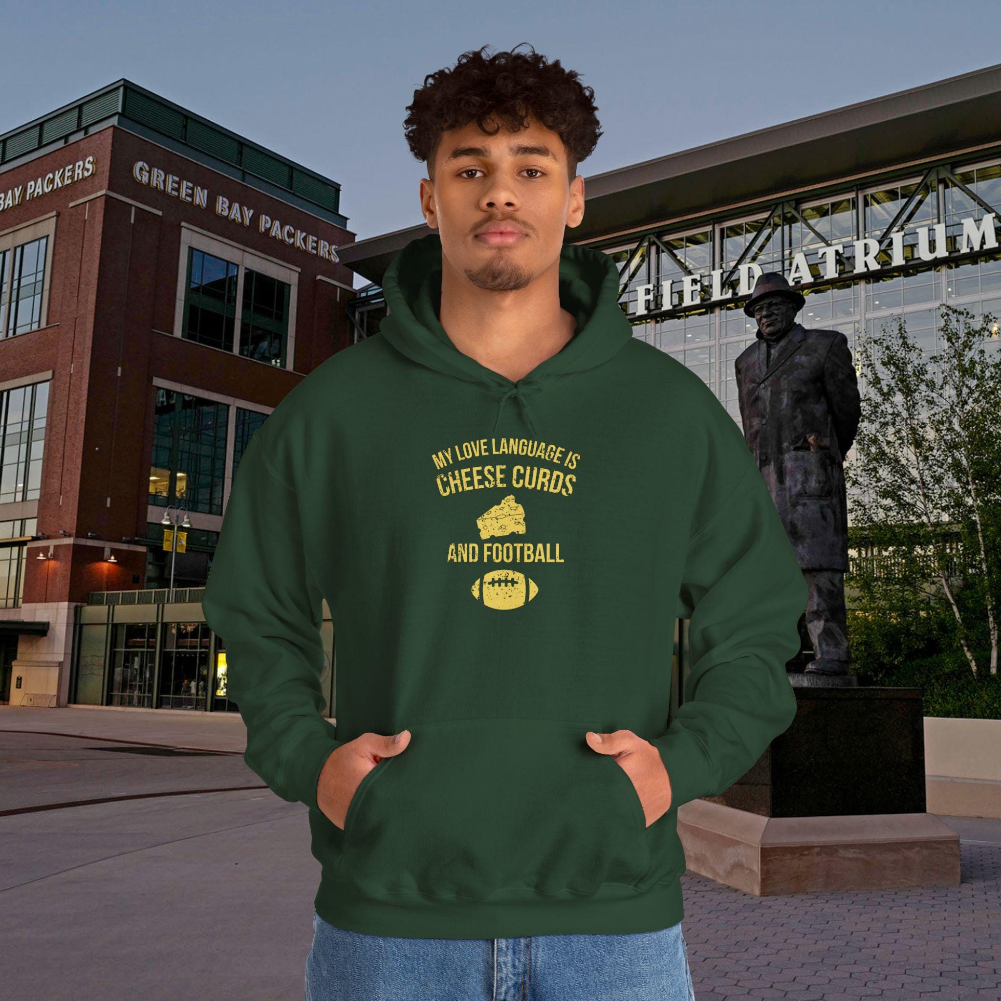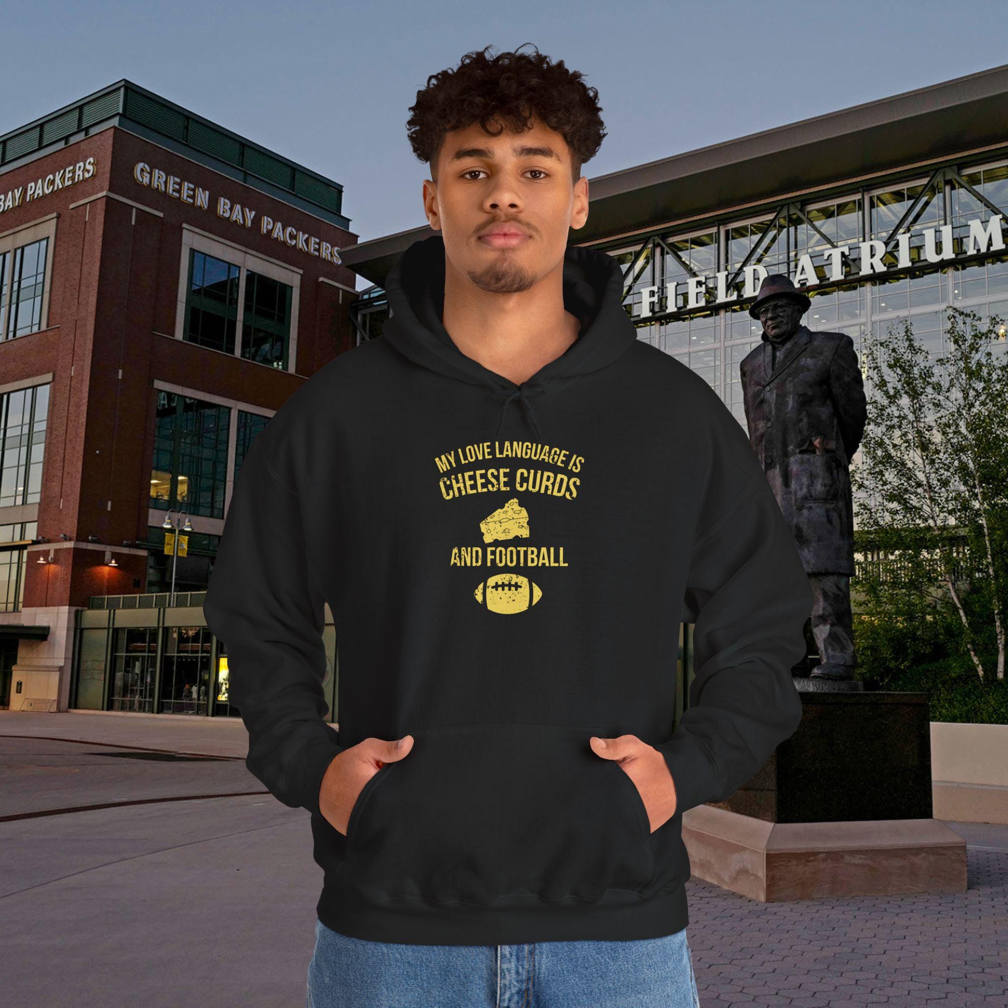 This hoodie speaks to anyone whose heart beats green and gold. Soft and substantial, it drapes like a second layer of fandom — warm hands tucked into the kangaroo pocket, hood pulled up against a chilly stadium wind. The design calls out a Packers-first love language: the quiet nod after a clutch play, the banter with friends during tailgate rituals, the way Sundays smell of grill smoke and good-natured rivalry. Wear it to watch parties, brisk morning walks, or game-day runs to the corner store. Embroidery and DTF print options give the graphics depth and texture, so your team pride reads as thoughtfully worn, not thrown on. This is for the adult fan who wants comfortable warmth, durable construction, and a piece that fits into the rituals that make football season feel like home.
