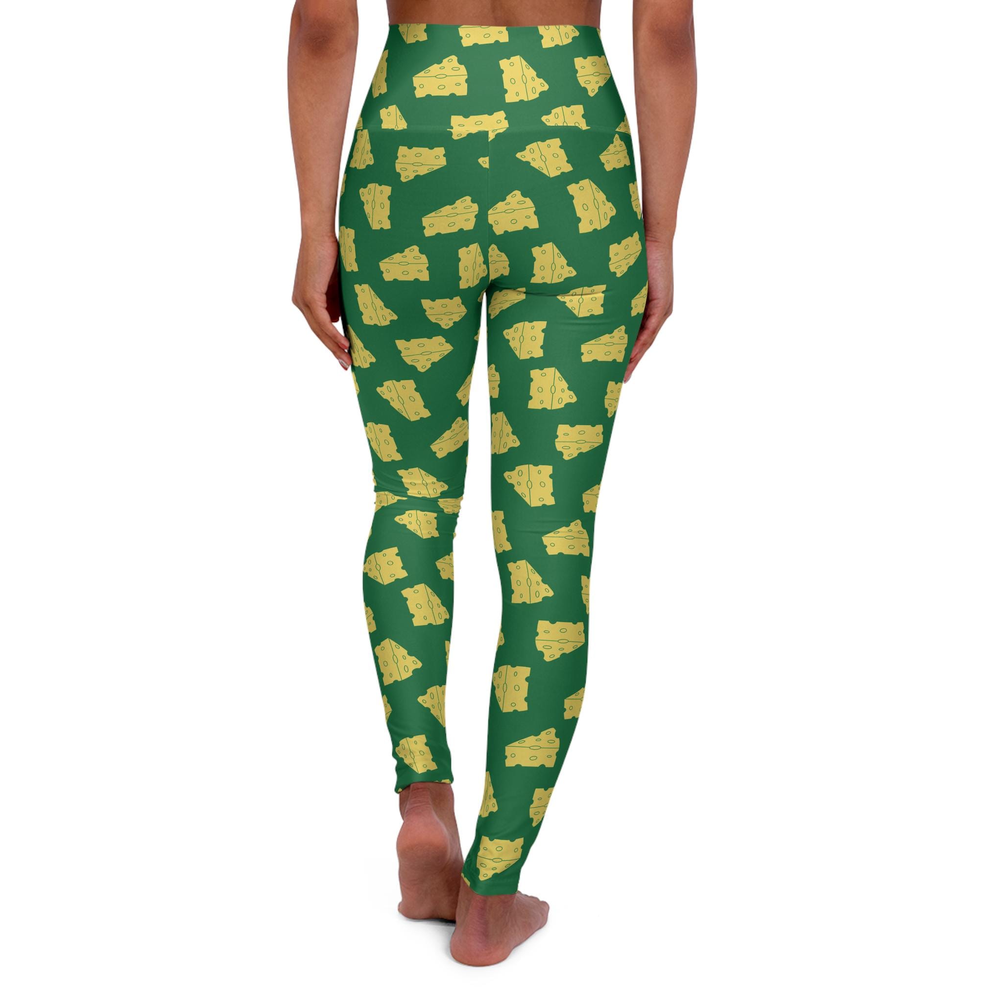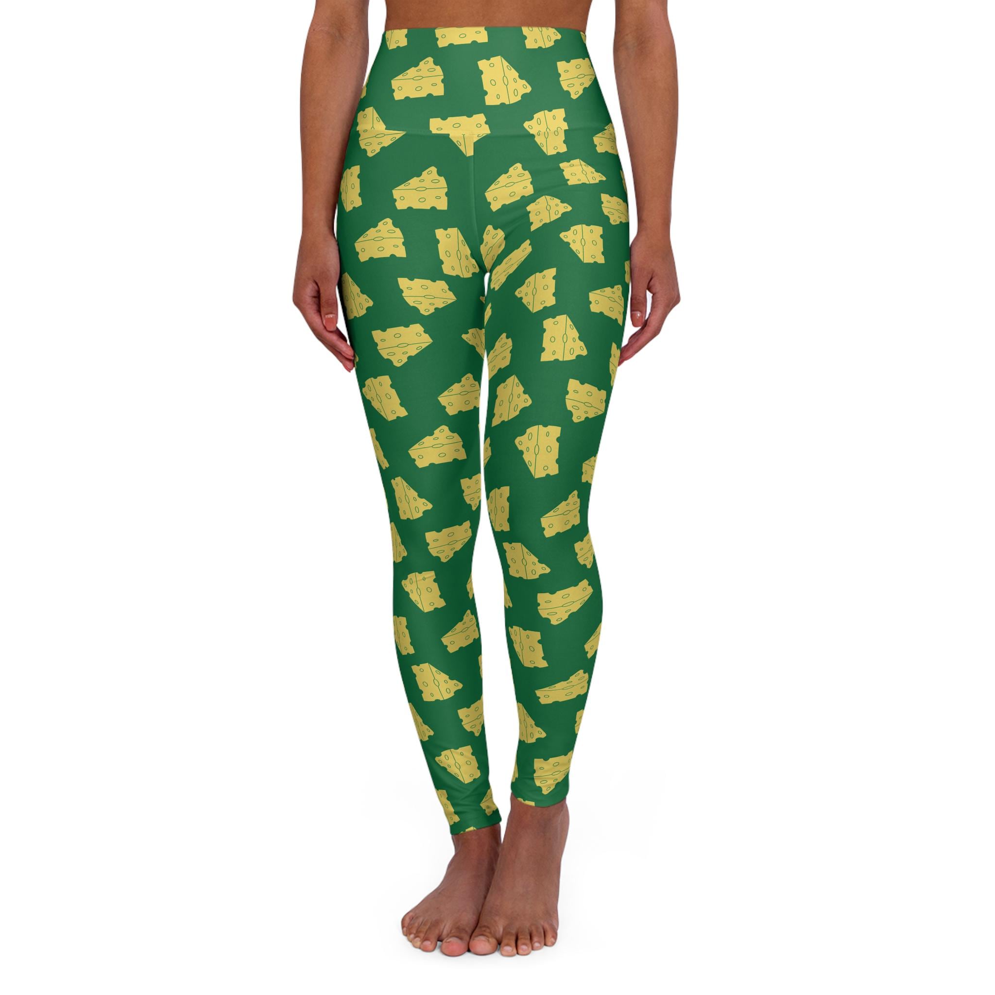 These high-waisted yoga leggings bring playful energy to movement. The all-over print of warm, buttery shapes set against a deep green field reads fun and bold whether you’re flowing through a morning vinyasa or running errands after class. The 4.5" double-layer waistband sits high and smooth, offering light core support and a streamlined silhouette that flatters while you bend and reach. Built from a quick-drying polyester-spandex blend with 4-way stretch, the fabric moves with you and snaps back into shape. Subtle color-matched outside seams keep the pattern continuous, while the interior white stitching and slightly sheer areas when stretched are natural traits of the fabric. These leggings are assembled in the USA from globally sourced parts — a lively, comfortable option for people who value style that works as hard as they do.